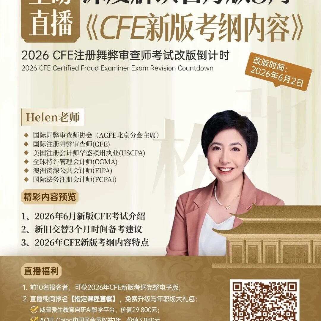 注意!美国注册舞弊审查师CFE考试要大改了! 2026年6月2日正式推行新版考试,旧版届时将停止使用,现在就是冲旧版的好机会!\n\n 新版CFE考试核心变化 \n从原来4部分改成3部分,题量和时长重