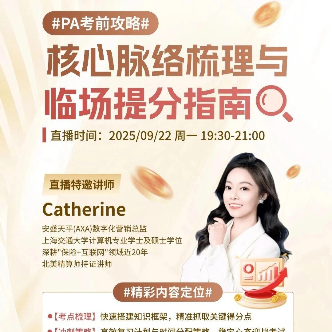【直播预告】PA考生必看!错过这场直播,考前可能少拿20分!SOA-PA考试进入倒计时,后期冲刺阶段该如何抓住重点?9月22日(周一)19:30-21:00,我们特别邀请Catherine老