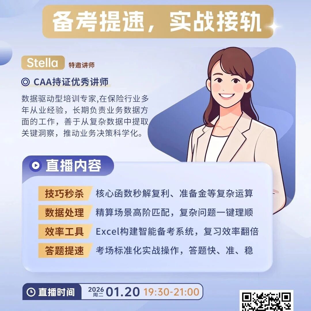 【直播预告】精算考试Excel全通关直播来啦精算场景下哪些Excel技能至实用?如何快速上手不费时间?怎样让Excel学习匹配备考需求?快来直播间,Stella老师将结合实务案例,讲解函数落