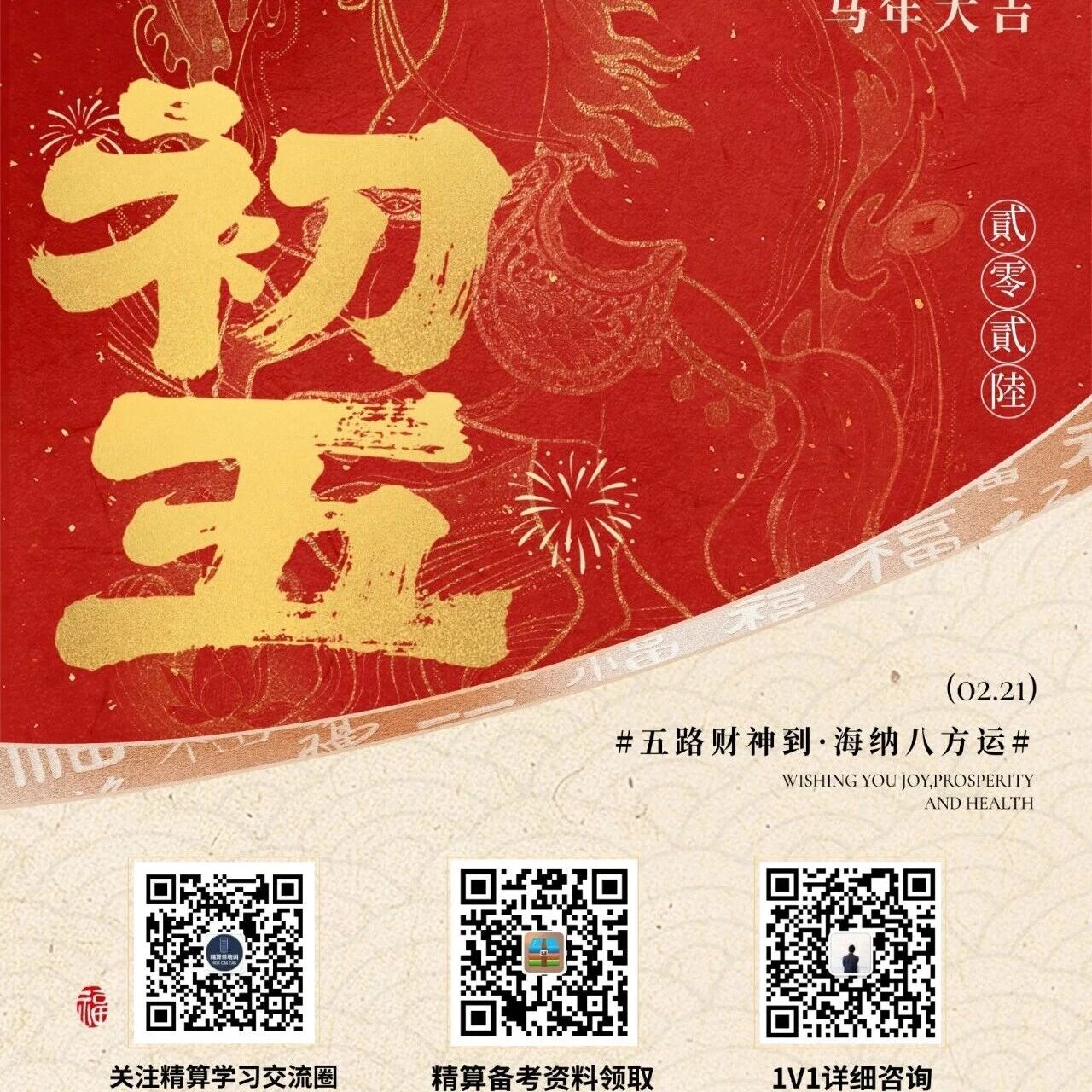 ²⁰²⁶/₂.₂₁ \n大年初五迎财神!\n˗ˋˏˎˊ˗ 年一路➠\n┍─┑\n|迎|锣鼓喧天爆竹响\n|财|顺风顺水顺财神\n|神|年初五·恭喜发财\n┕─┙\n---------------
