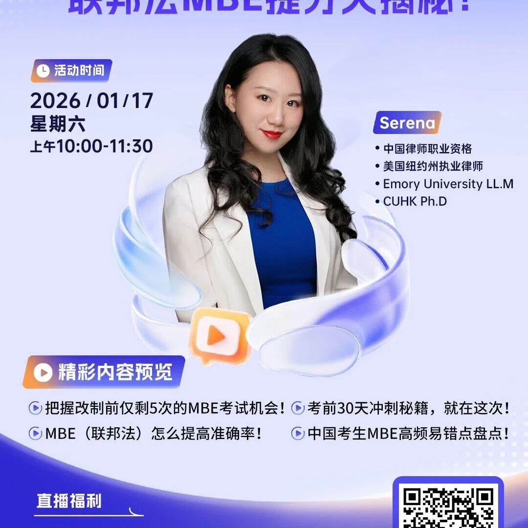 2月CABAR考前冲刺!联邦法MBE提分大揭秘!😁适合人群:1.计划备考2026年2月或7月美国律考考生;2.对涉外律师考试感兴趣或者有一定了解;3.希望扩大职业交流平台和拥有国际视野的法律