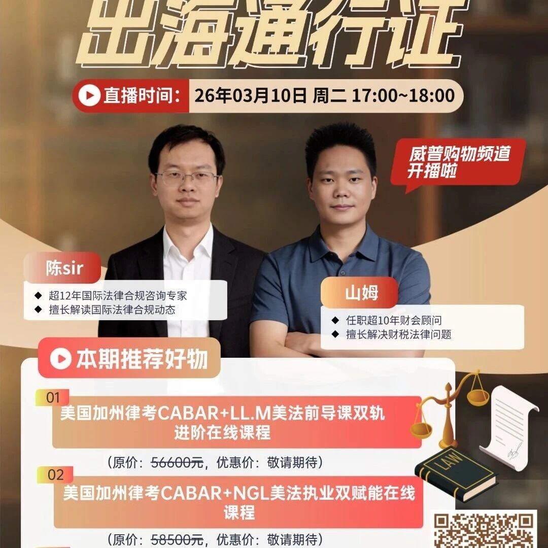 想做跨境法律业务,却不知道从哪下手?证书、合规、财税问题一团乱麻?别慌!这场直播直接把「出海通行证」送到你面前\n\n直播专属优惠价,比原价省出大几千!还赠送学习大礼包!\n\n本期核心干货:\n✅美