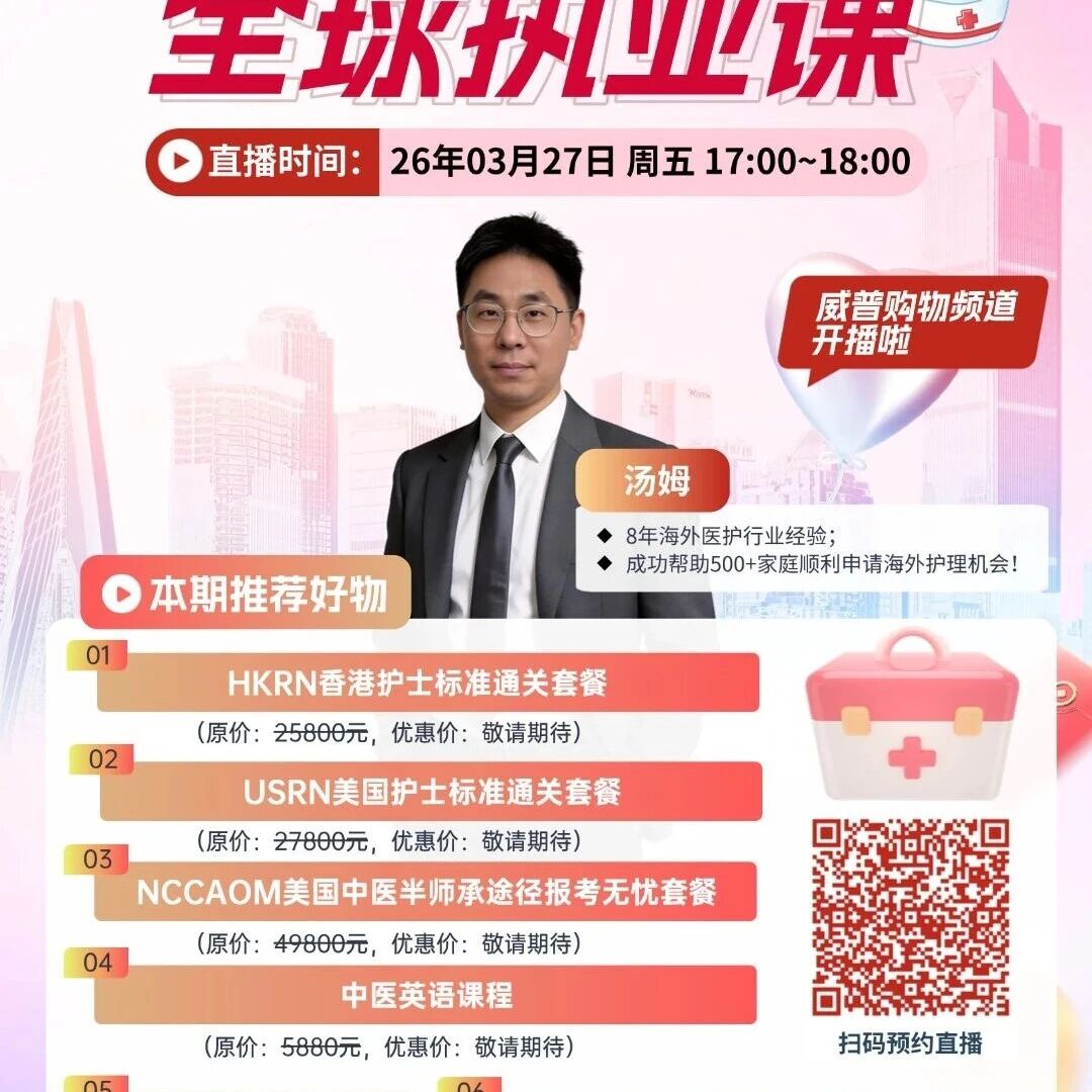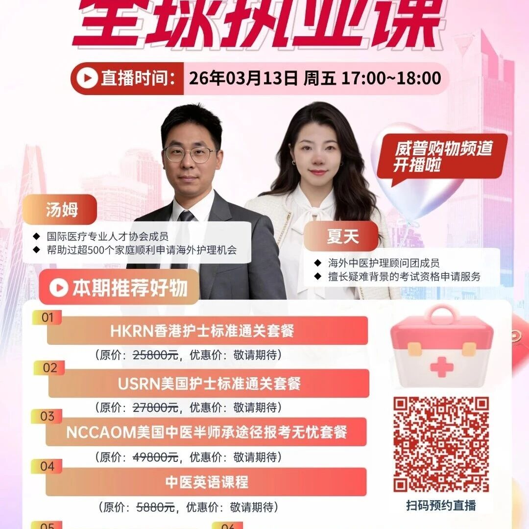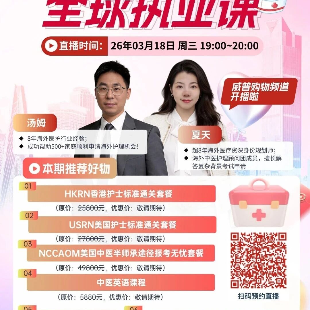 中医护理出海,这几年越来越多人在讨论。香港护士、美国护士、美国中医执业,听起来机会不少,但很多人其实并不知道:自己到底适不适合走这条路?这场直播,我们把几条常见路径拆开讲一讲。\n\n威普购物频道|2