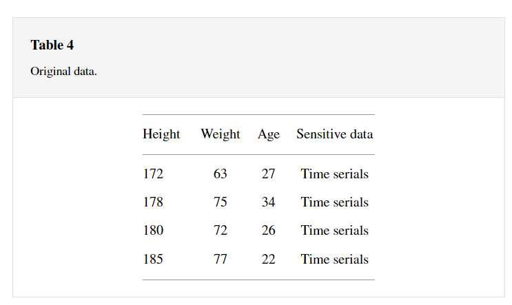 例如,如表4所示,Alice 是医疗可穿戴设备的所有者,该设备的制造商收集该设备产生的数据以及有关她的年龄、身高和体重的信息。然后数据持有者共享一个包含 Alice 数据的数据集(如表4所示)。