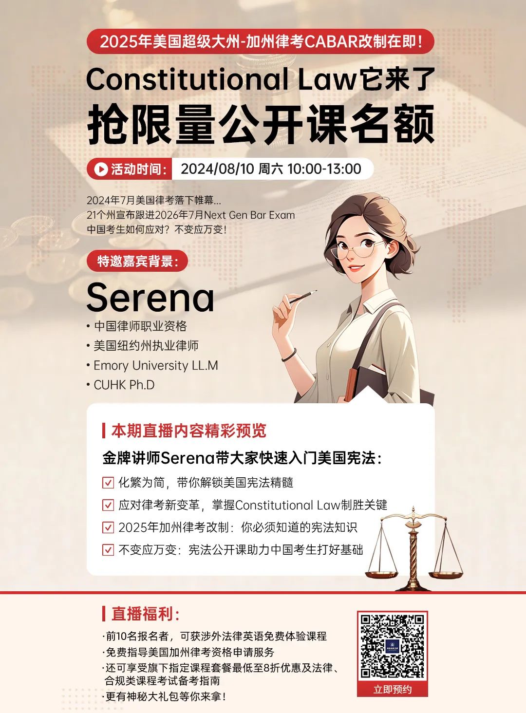 2025年7月CABAR报名开始啦!你准备好了吗?2025年4月12日(星期六)上午10:00-12:00分,为了让大家能更全面了解“CABAR加州律考”,在本次开展的公益分享系列课堂中,特别邀请金牌讲师Serena与我们分享关于CABAR加州律考Real Property物权法等精彩内容。