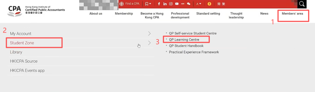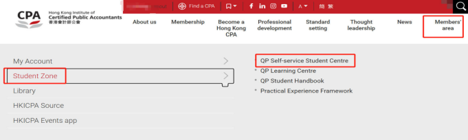 1️⃣进入官网 https://www.hkicpa.org.hk/,输入账号密码登录,依次 Member’s area - Student Zone - QP Self-service Student Centre,进入学生中心。
