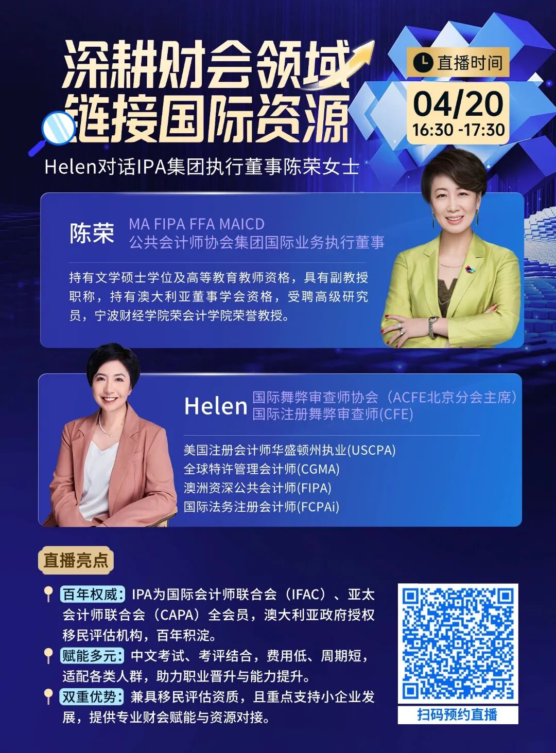 本次直播ACFE北京分会主席Helen女士特别邀请IPA集团国际业务执行董事陈荣女士深度解读: