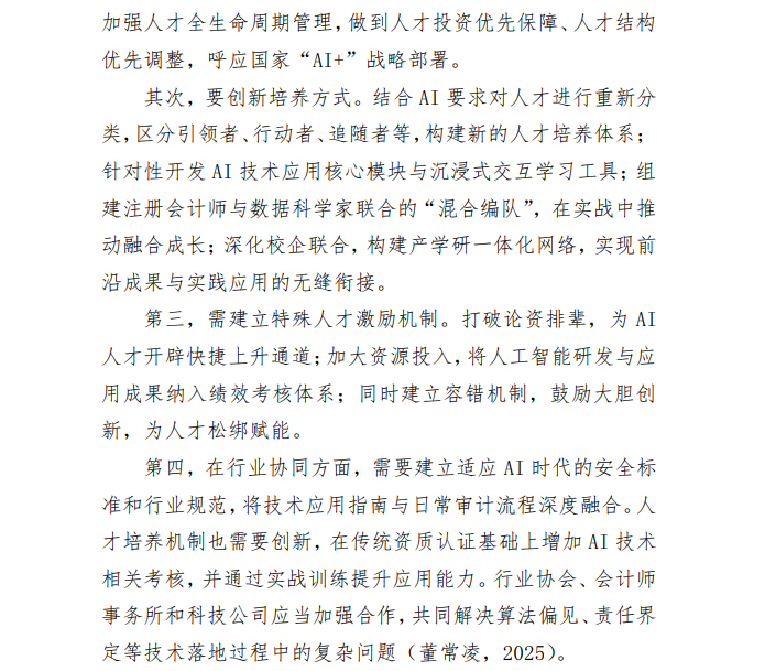 行业应加快推动CPA持续教育体系的数字化升级,培养既懂专业又懂技术的复合型人才。同时,明确AI应用的伦理底线,强化对算法偏差与职业操守的监管。