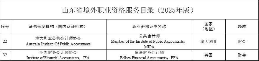 4、公共会计师(Member of Institute of Public Accountants,MIPA)与资深财务会计师(Fellow of Institute of Financial Accountants,FFA)被同时纳入《山东省境外职业资格服务目录(2025年版)》。