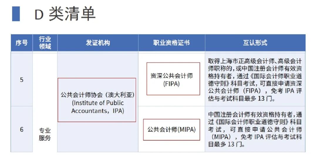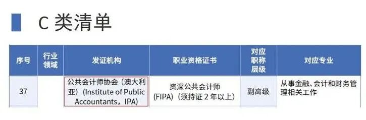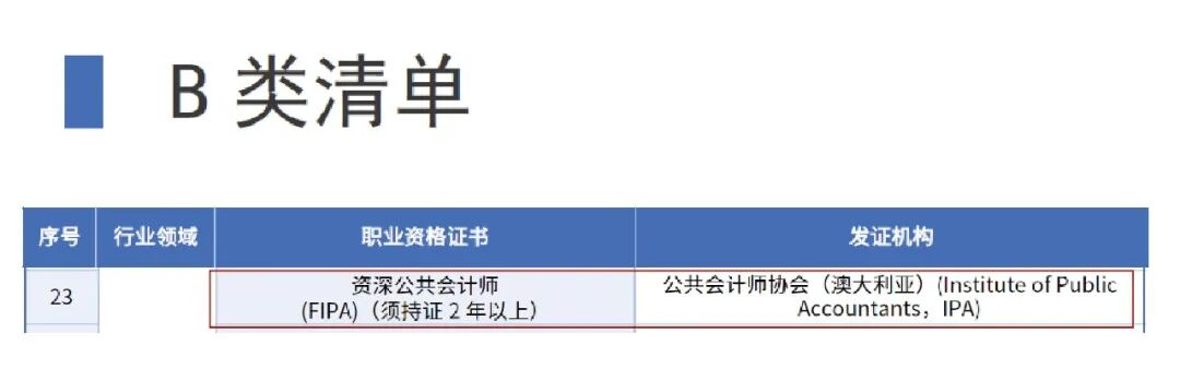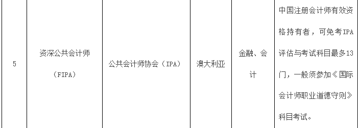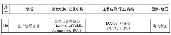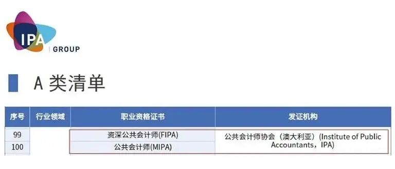 3、公共会计师协会(Institute of Public Accountants,IPA)的公共会计师会籍资格(Member of Institute of Public Accountants,MIPA)与资深公共会计师会籍资格(Fellow of Institute of Public Accountants,FIPA)被纳入《广州市南沙区境外职业资格认可清单2.0》
