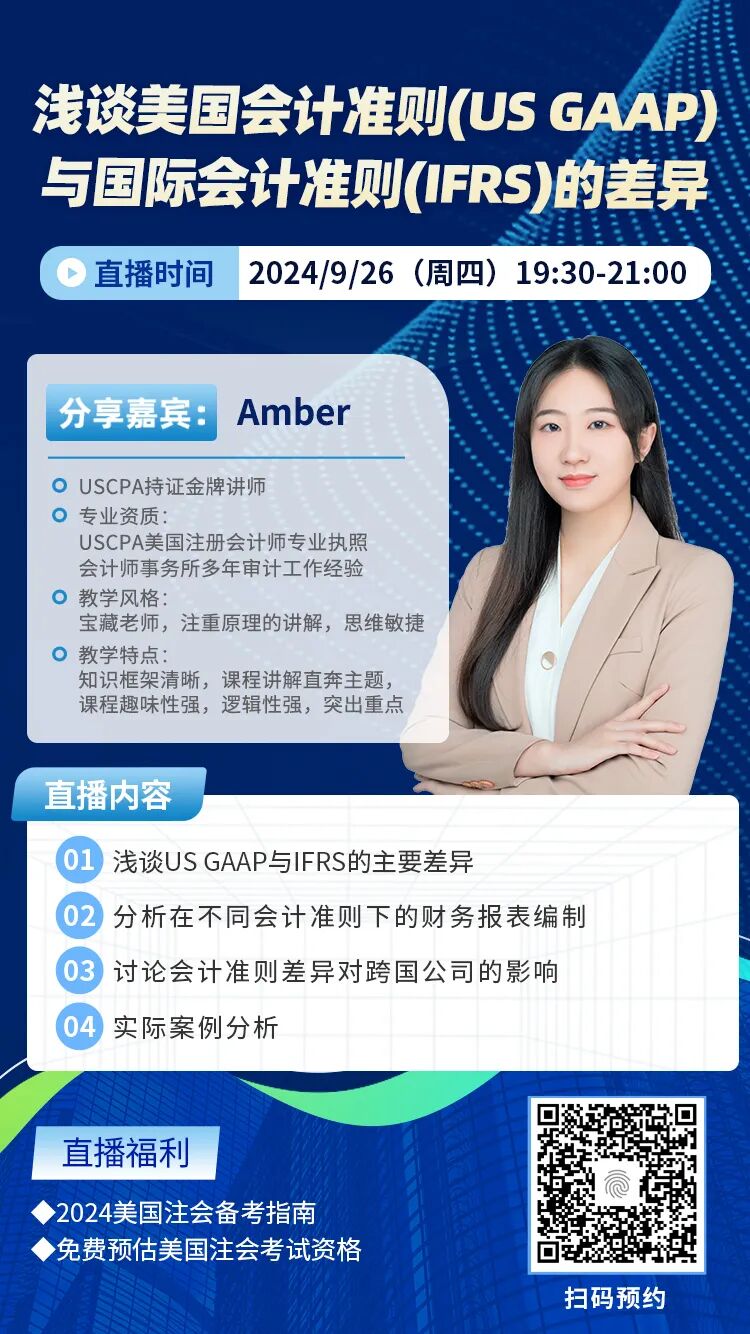 为了帮助大家进一步拓展专业知识,我们将在9月26日晚上7点30分举行一场特别直播,主题为“浅谈美国会计准则(US GAAP)与国际会计准则(IFRS)的差异”。这次直播将由USCPA持证金牌讲师Amber主讲,主要分享内容为: