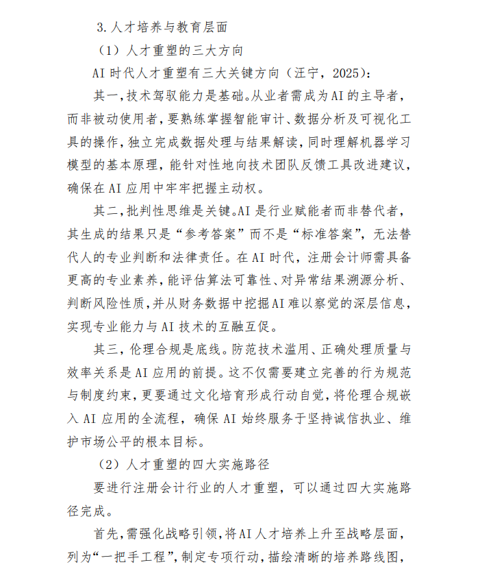 行业应加快推动CPA持续教育体系的数字化升级,培养既懂专业又懂技术的复合型人才。同时,明确AI应用的伦理底线,强化对算法偏差与职业操守的监管。