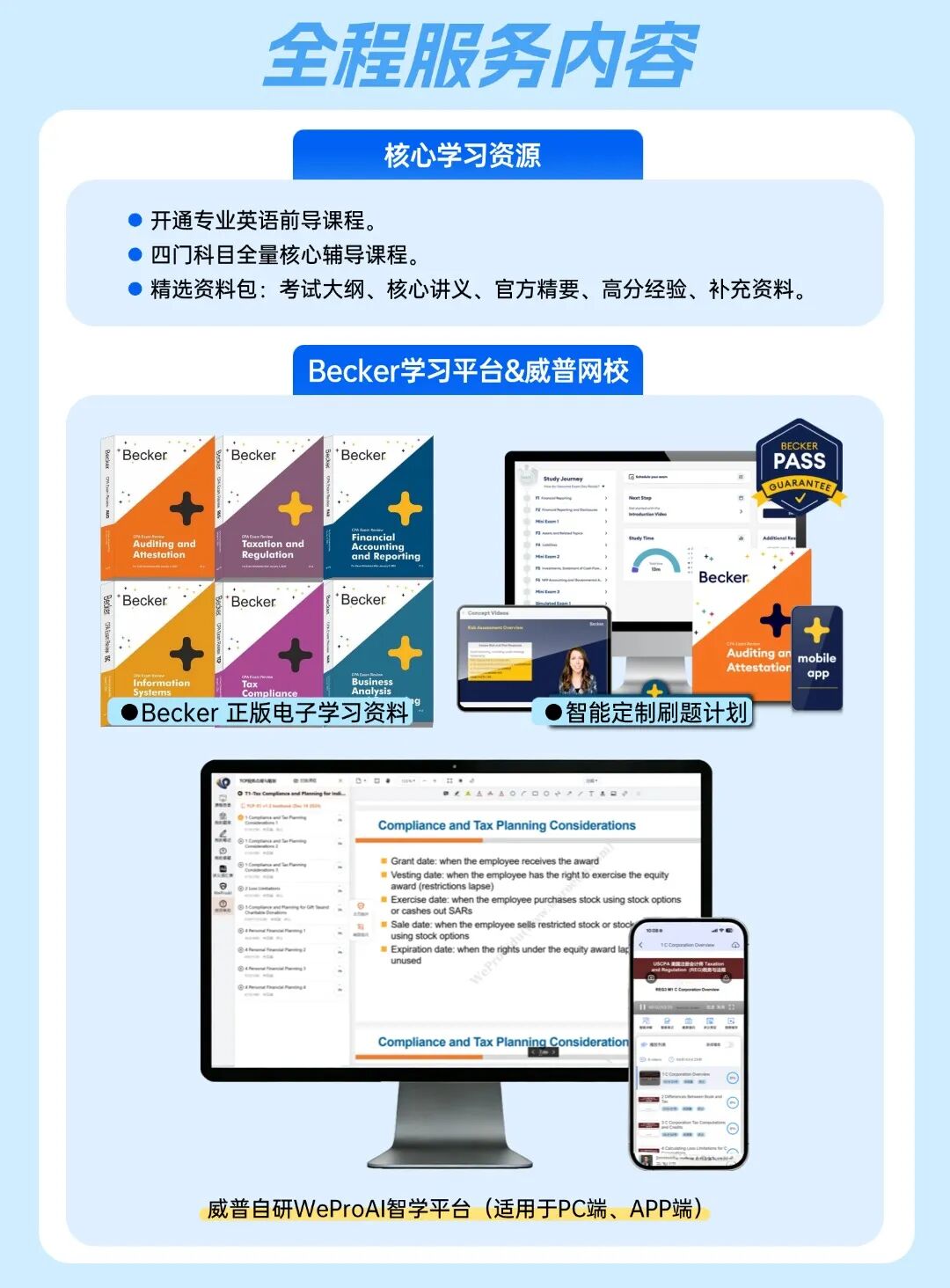威普爱生教育作为Becker在国内的授权合作伙伴,精心打造的快速通关USCPA认证的中英双语高效备考方案, 有学员至快8个月就通过USCPA!