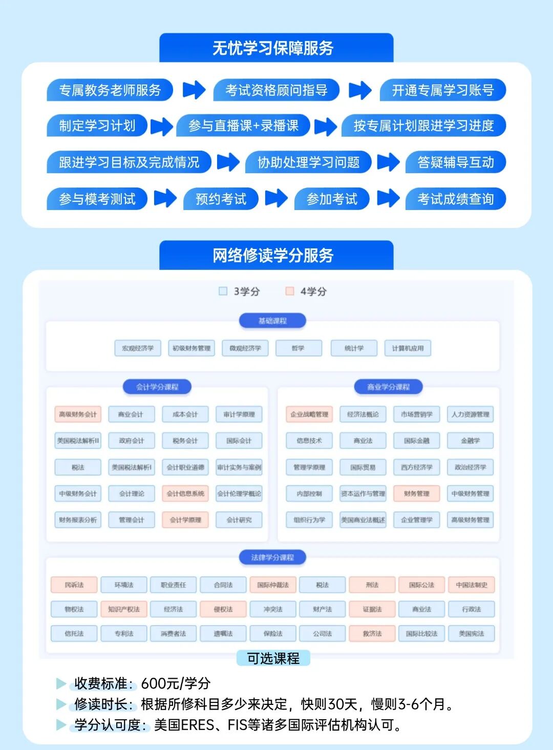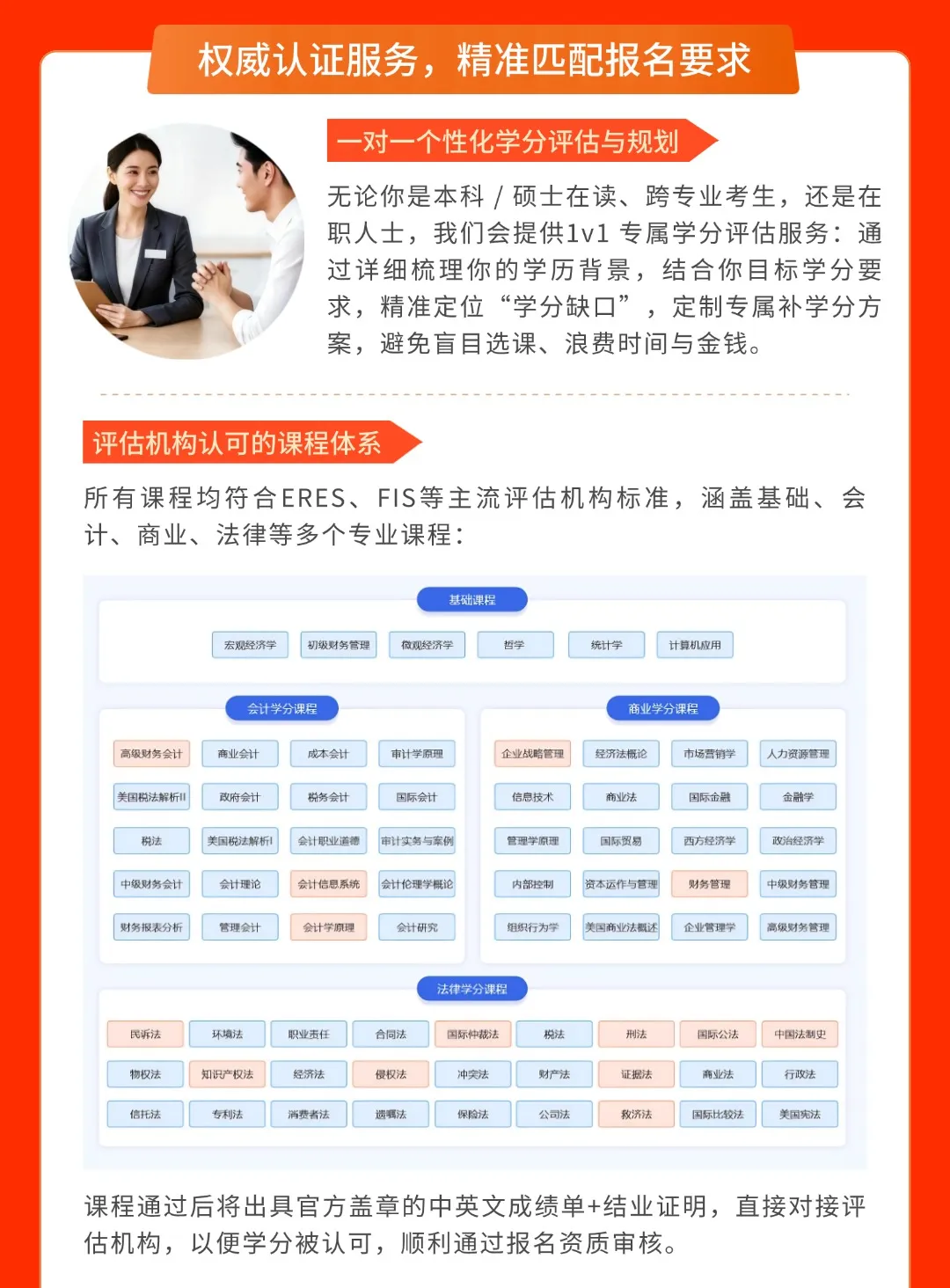 评估机构认可:所有课程均经过多家主流评估机构(如ERES FIS)的审核,完成课程后获得的学分可直接用于报考,无需担心认证问题。