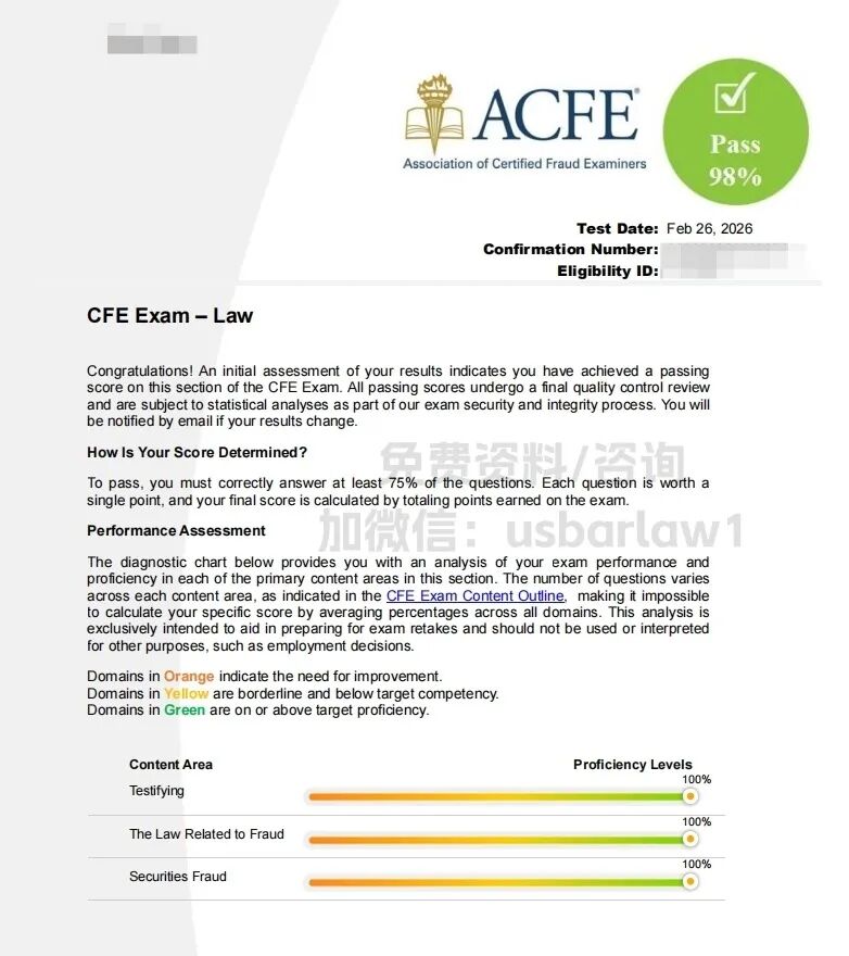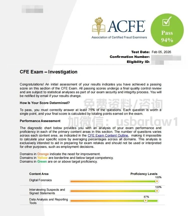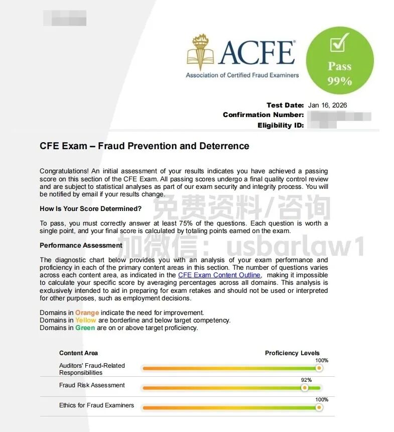 J同学如此优异的成绩,不仅意味着对四门核心科目的知识点掌握得炉火纯青,更体现了卓越的细致、严谨与逻辑分析能力——毕竟CFE考试常在细节处设置陷阱,每一道题都考验着对反舞弊专业知识的准确运用与灵活应变。