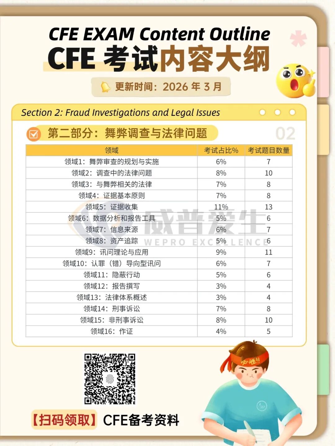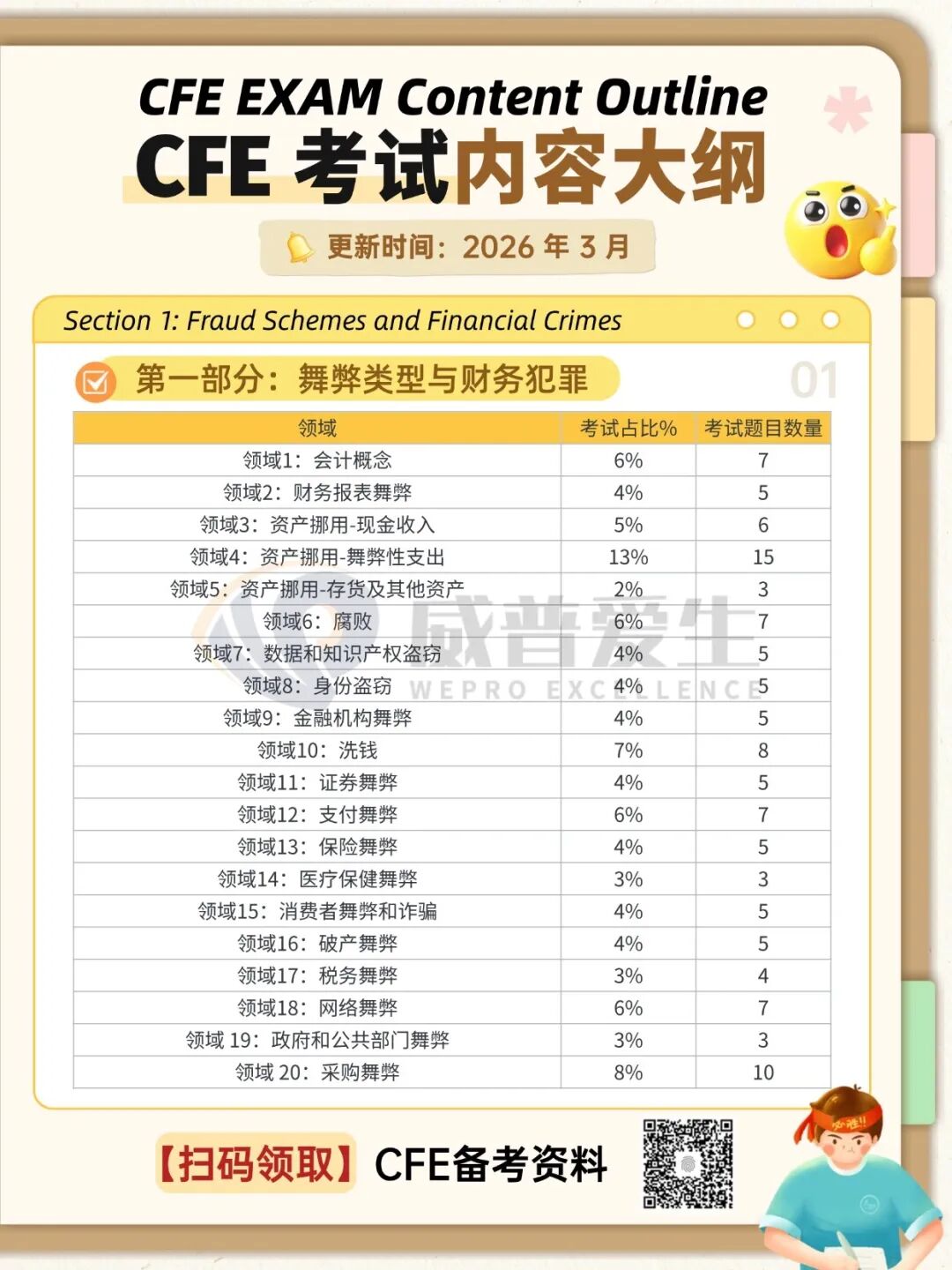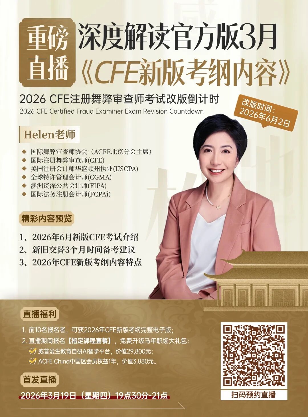 对CFE改制感兴趣的小伙伴可以预约观看本周四晚上19:30的直播!2026 CFE注册舞弊审查师考试改版倒计时——深度解读官方版3月《CFE新版考纲内容》为了让大家顺利备考CFE美国注册舞弊审查师考试”,特别邀请ACFE国际注册舞弊审查师协会北京分会主席Helen与我们分享关于CFE改制的精彩内容。