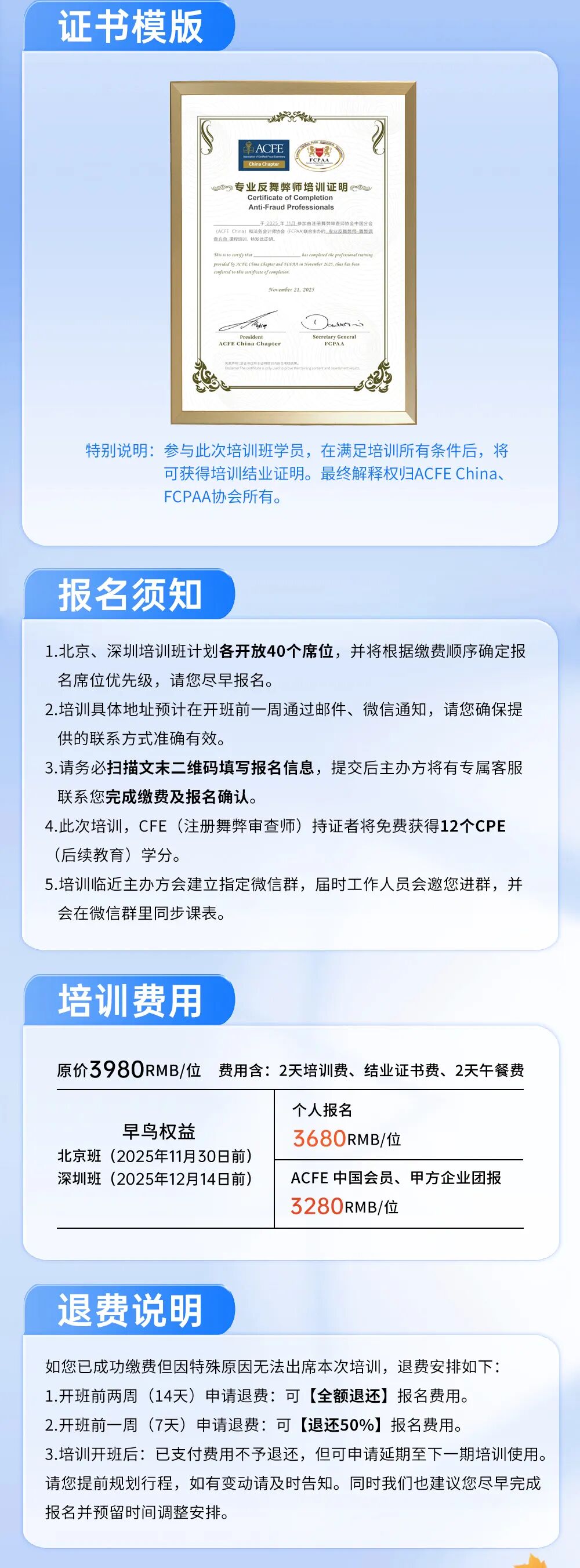 由于8月的时候许多小伙伴不在上海,也抽不出时间前往线下参加课程,ACFE China加急筹备了第二期的【“舞弊与商业犯罪调查”】培训班,地点分别设定在北京和深圳,希望能帮助到更多想学习的粉丝朋友!