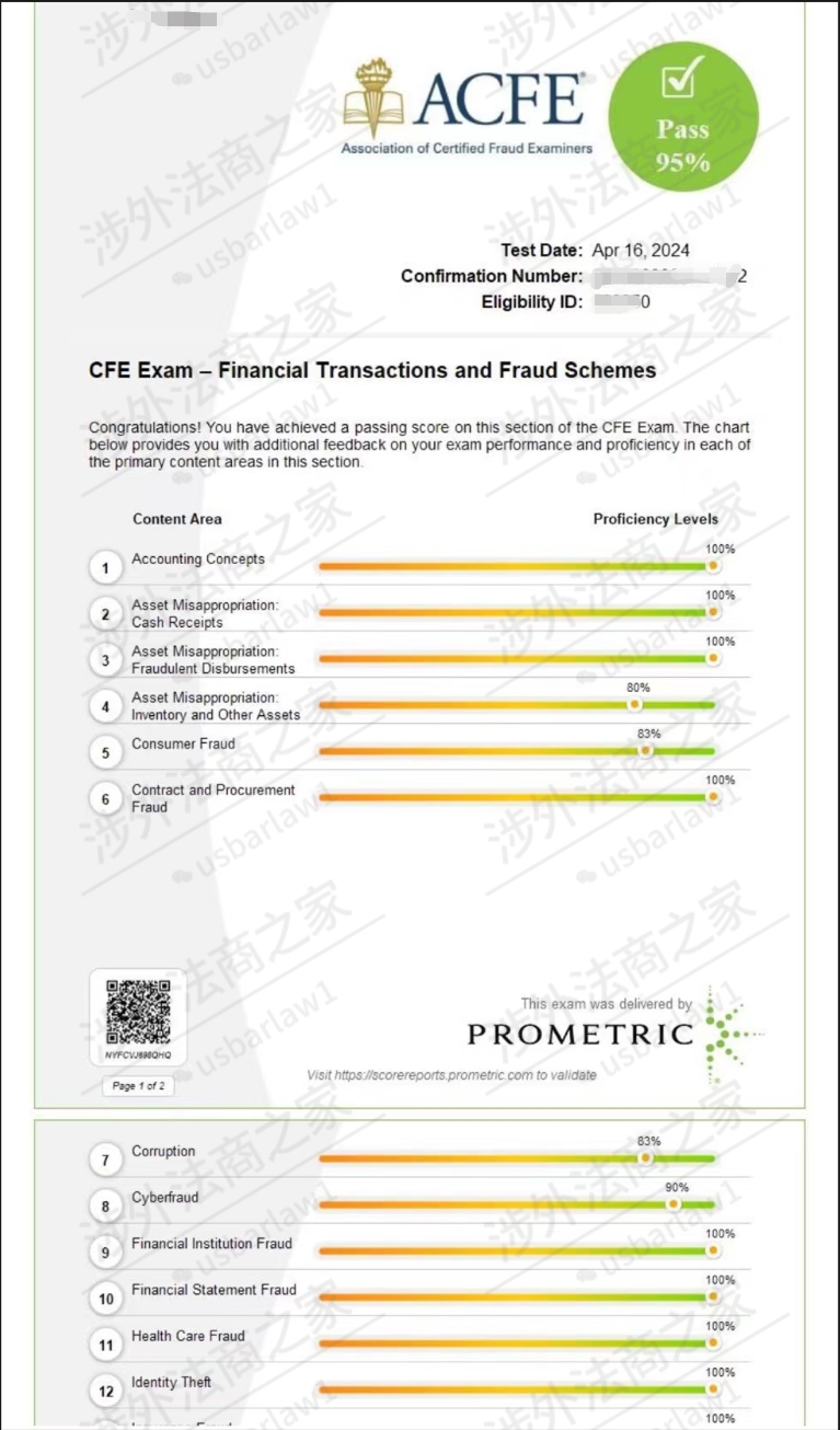 四个科目我都是高分(满分100分,75分合格)通过的,法律 99 分,调查 91 分,舞弊预防与威慑 93 分,财务交易和舞弊阴谋95分。