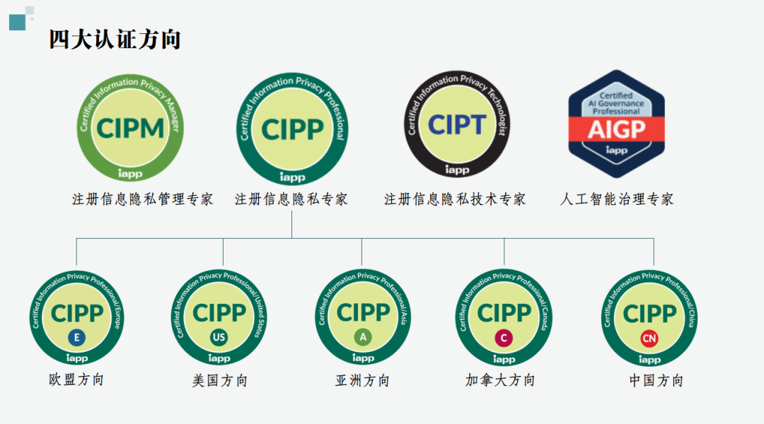 CIPP证书又分为5个方向,包括CIPP/E欧盟方向、CIPP/US美国方向、CIPP/A亚洲方向、CIPP/C加拿大方向以及近来上线的CIPP/CN中国方向。