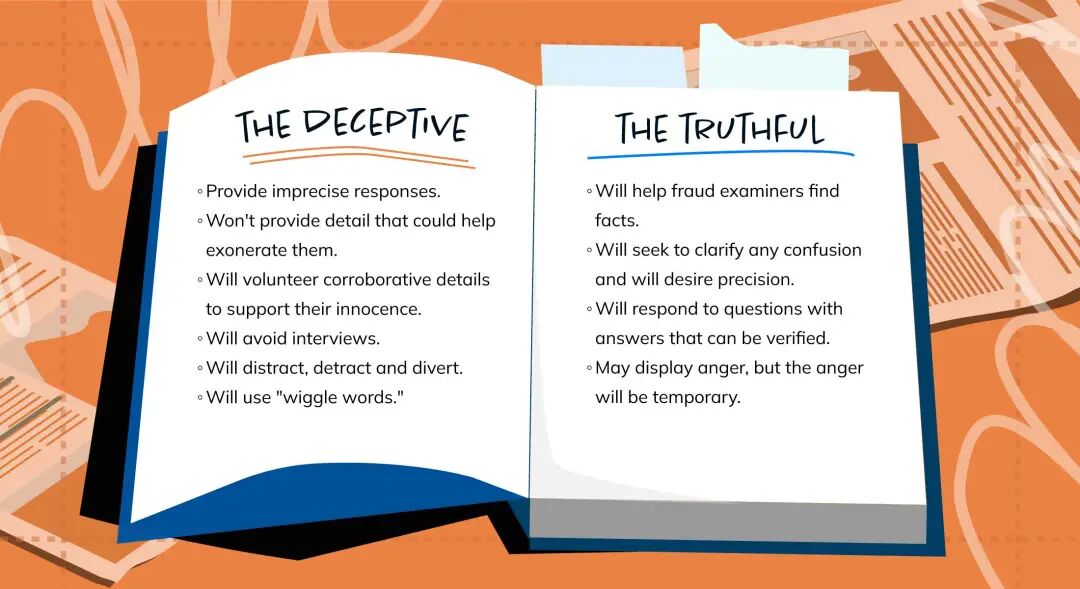 正如我们需要意识到自己的偏见和成见一样,我们也需要理解谎言的本质以及人们是如何构建谎言的。我将谎言定义为部分真相,每个谎言中都有一个真相的内核。随着我们从孩童成长为成年人,我们通过在谎言中编织一些真相,磨练了自己成为“部分真相讲述者”的技巧。人们往往会通过说服自己“因为包含了一些真相,所以并没有完全撒谎”来为此寻找借口。完全没有任何真相的陈述实际上非常罕见,欺骗性陈述通常都包含一点点真相。这正是事实调查访谈过程如此困难的原因所在。你可能会在陈述中听到一些真相,并因此假设其余部分也是真实的。一个善于欺骗的人深知这一点,并会利用这一点对自己有利。我们都希望听到真相;我们的本能是相信我们被告知的事情。要识别信息中的诡计需要付出额外的努力。