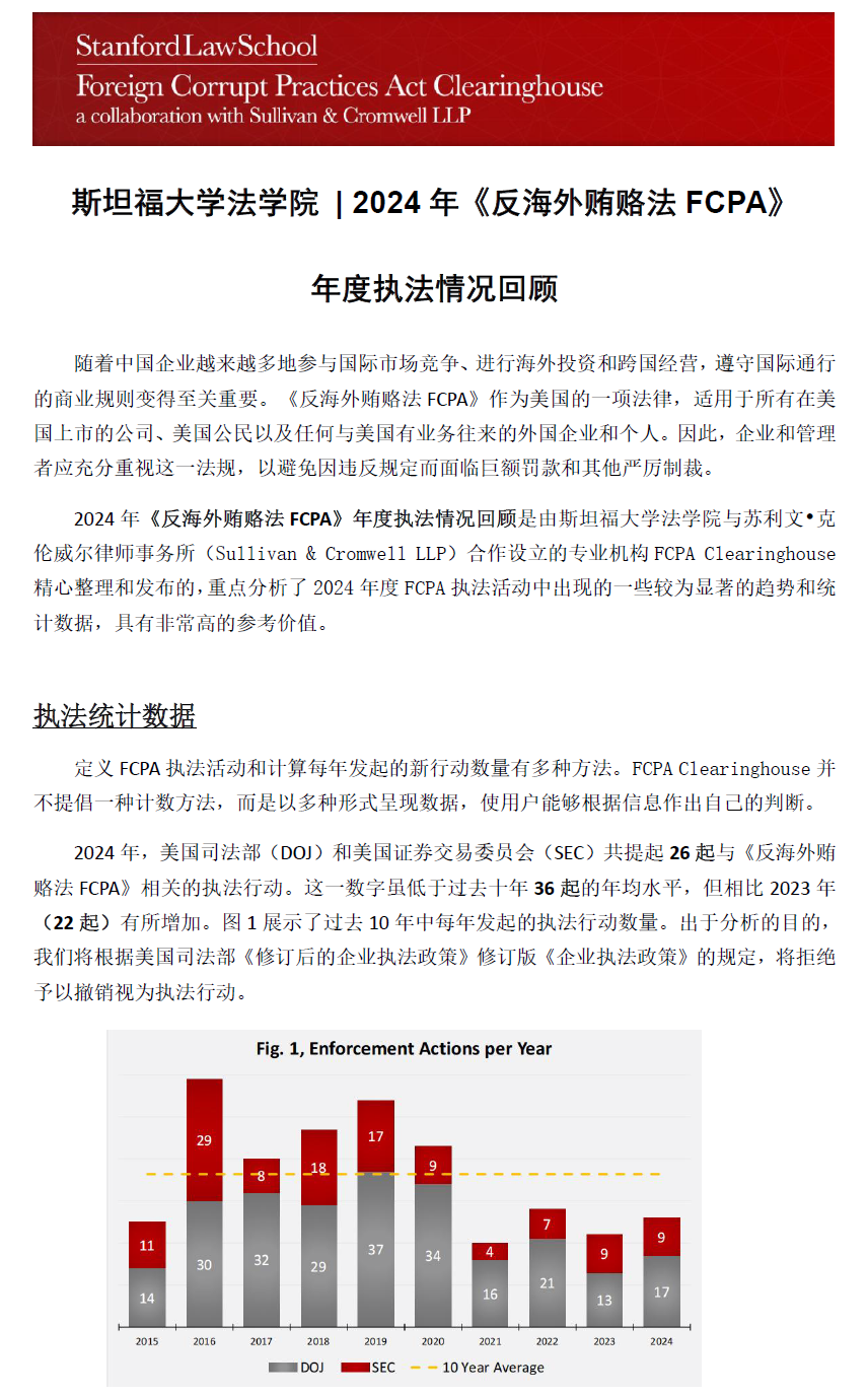 2024年《反海外贿赂法FCPA》年度执法情况回顾是由斯坦福大学法学院与苏利文.克伦威尔律师事务所(Sullivan & Cromwell LLP)合作设立的专业机构FCPA Clearinghouse精心整理和发布的,重点分析了2024年度FCPA执法活动中出现的一些较为显著的趋势和统计数据,具有非常高的参考价值。