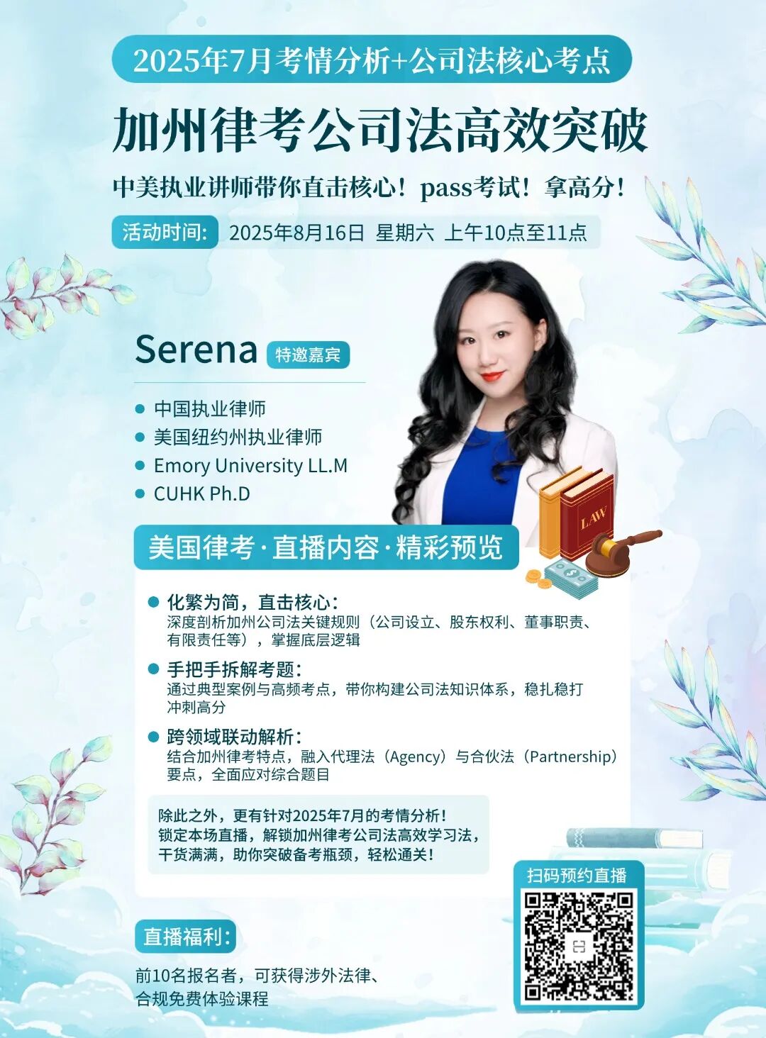 为了更好地应对2026年2月&7月美国加州律考CABAR,我们也上线了一系列直播课程(包含公开课及内部学员专属直播)目前Serena老师的USBAR美国律考系列直播持续更新中!