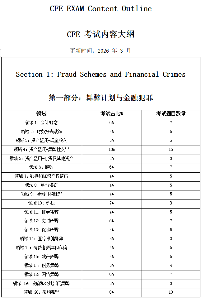 虽然大多数基础概念保持不变,但新的 CFE 考试涵盖了许多近年来涌现的主题、最佳实践和技术进步,这些内容将持续影响未来的反欺诈形势。此外,大量内容将在考试科目和内容领域(例如,《反舞弊审查师手册》 章节)之间进行调整,这将使考生难以使用旧版学习资料进行复习。