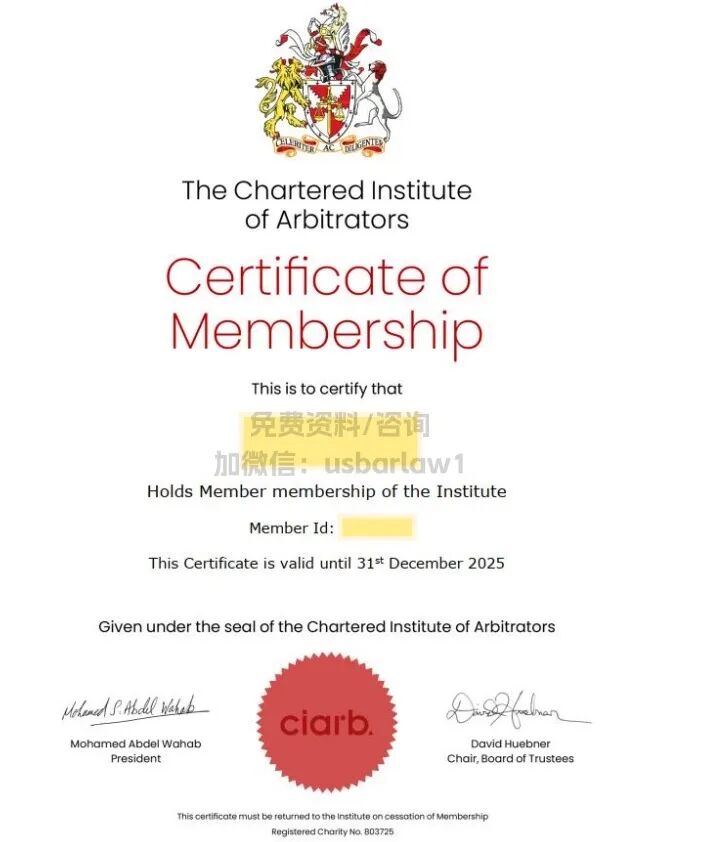 CIArb的Member会员资格有很高的含金量,表明持有者拥有较高的仲裁知识储备和技能,达到了国际仲裁员的标准。