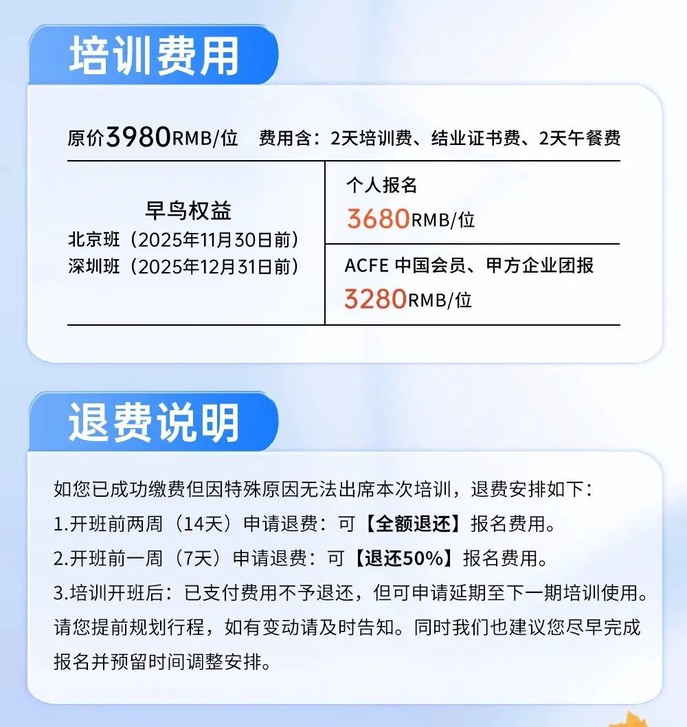 ✨ 资源加持:参训学员纳入ACFE China会员人才库,享专属职业发展支持与行业资源对接!