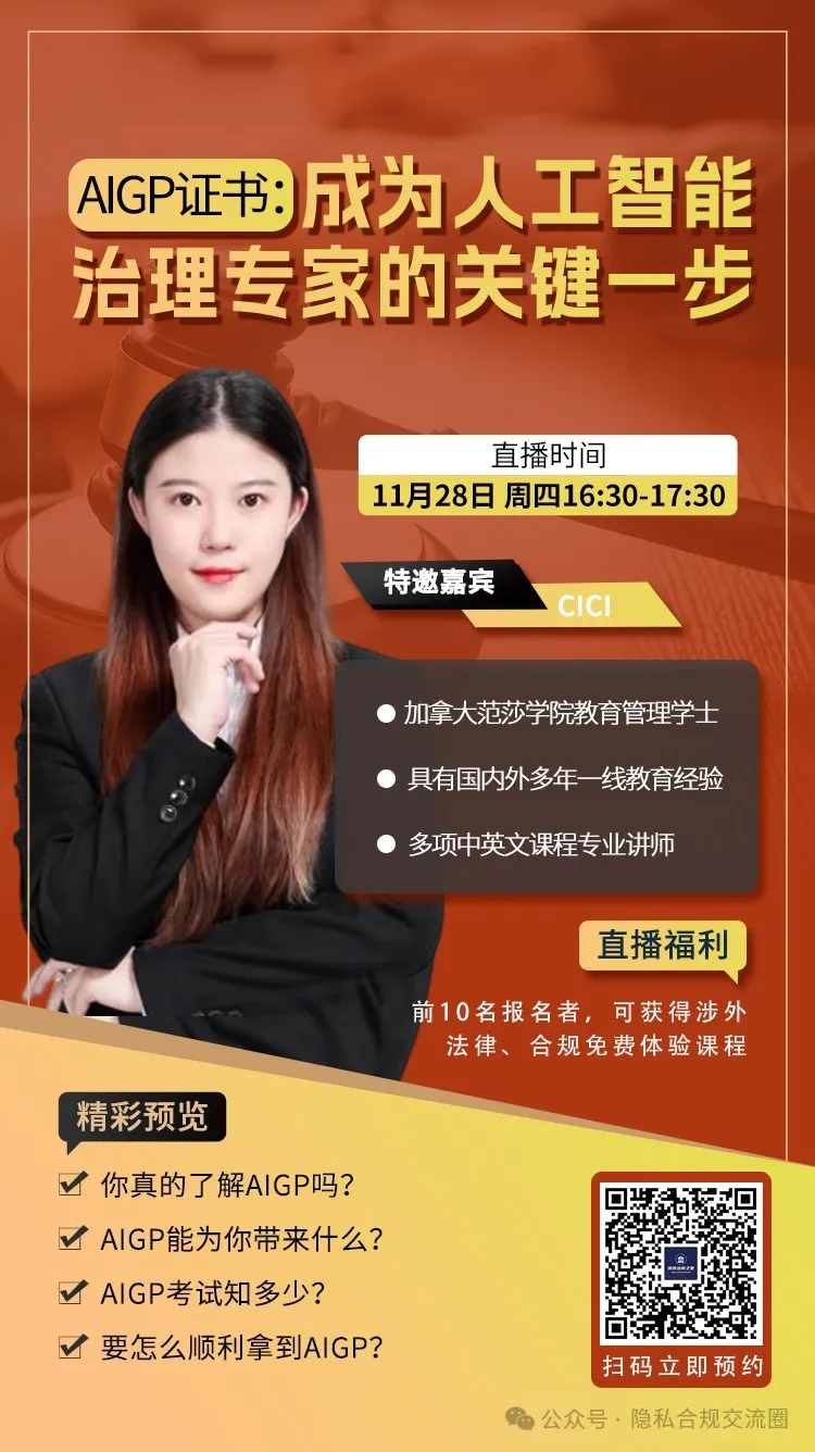 2024年11月28日(星期四)下午16:30-17:30分,为了让大家能更全面了解“AIGP人工智能治理 ”,在本次开展的公益分享系列课堂中,特别邀请多年教育经验的Cici老师与我们分享关于AIGP考试等精彩内容。
