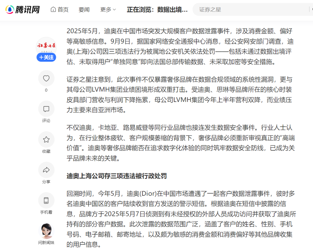 2025年9月,中国因三起严重《个人信息保护法》违规事件处罚了迪奥上海子公司:未经授权的跨境数据传输、不充分的用户同意实践和技术安全措施。
