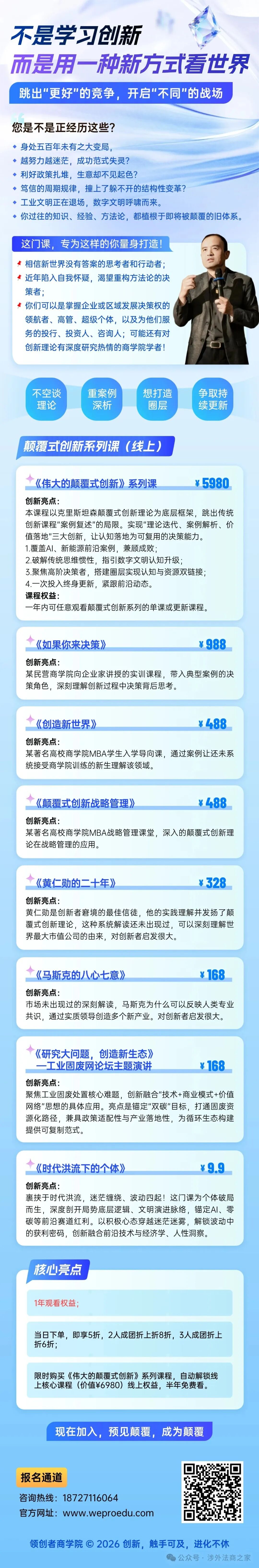 与其在旧世界里焦虑,不如用一次学习的投入,获得终身更新的认知武器。跳出“更好”的竞争,开启“不同”的战场——用新方式看世界,才能为你的客户,也为你自己,找到穿越变革周期的答案。