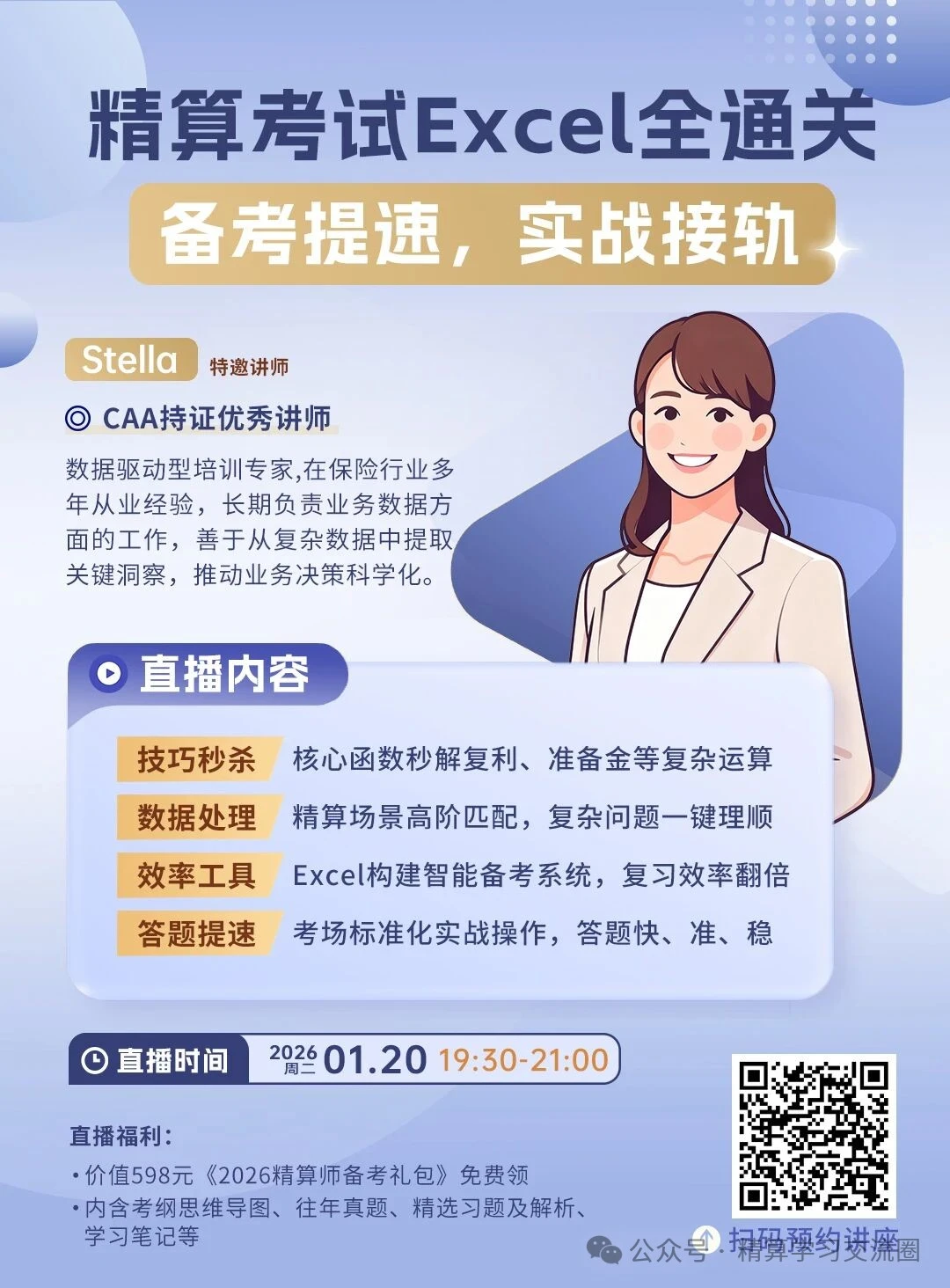 精算场景下哪些Excel技能至实用?如何快速上手不费时间?怎样让Excel学习匹配备考需求?快来直播间,Stella老师将结合实务案例,讲解函数落地用法,高效掌握Excel备考核心能力!