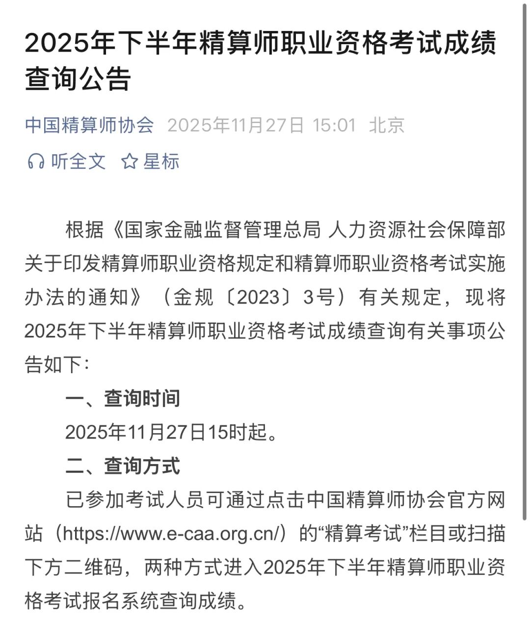 就在刚刚,中国精算师协会公布了《2025年下半年精算师职业资格考试成绩查询公告》。