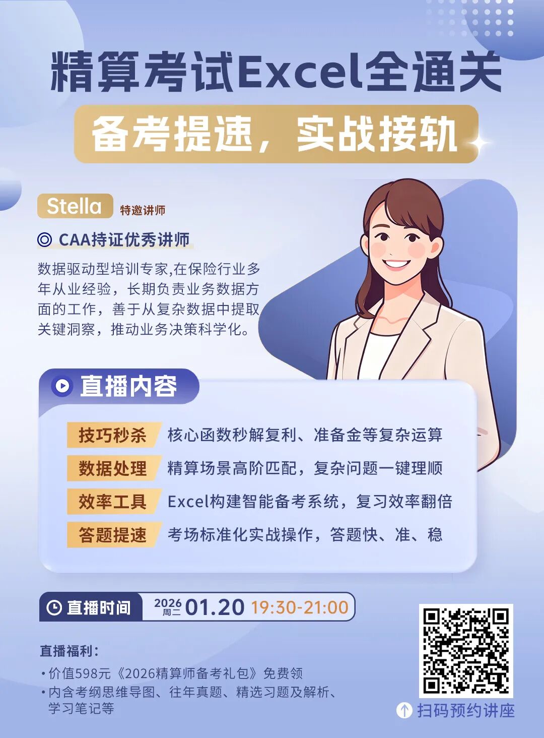 精算场景下哪些Excel技能至实用?如何快速上手不费时间?怎样让Excel学习匹配备考需求?快来直播间,Stella老师将结合实务案例,讲解函数落地用法,高效掌握Excel备考核心能力!