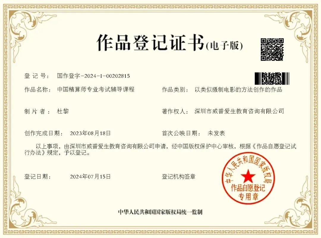 威普爱生教育咨询有限公司-中国精算师专业考试辅导课程获得中国国家版权局作品登记证书!中国精算师课程版权登记成功,是一项官方认证凭证,是一种荣誉,通过登记机构的定期公告可以向社会宣传中国精算师课程培训。