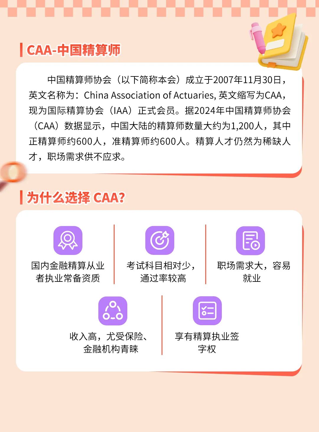 CAA中国精算师协会是中国官方精算师管理组织,负责组织中国精算师考试及资格认证。