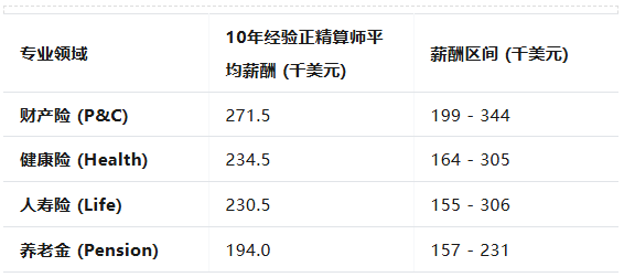 在精算师职业生涯的中期(以10年经验为例),不同专业领域的薪酬水平存在明显差异。