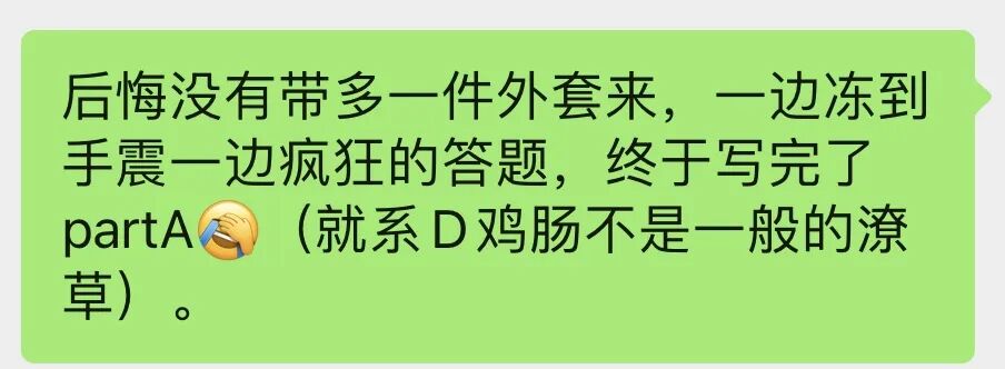 还有就是,考场的冷气足的和不要钱一样,冻到小手发颤儿......供接下来参加考试的小伙伴们参考!