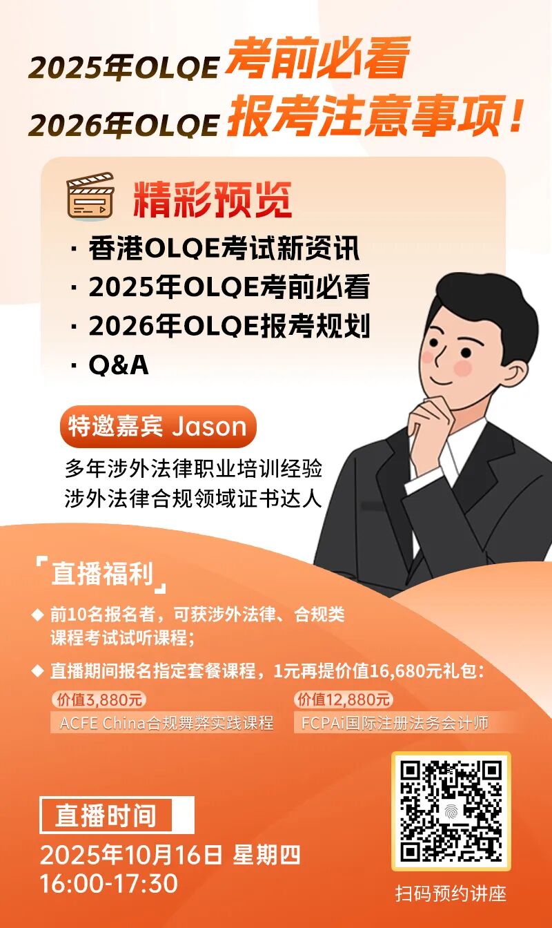 2025年OLQE考前必看&2026年OLQE报考注意事项!为了让大家能更全面解“OLQE香港律师考试”,特别邀请法律合规证书达人Jason与我们分享关于OLQE的精彩内容。错过直播的小伙伴可以前往链接或者扫码观看回放