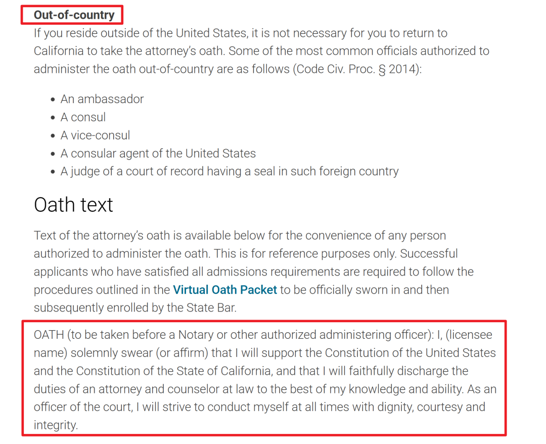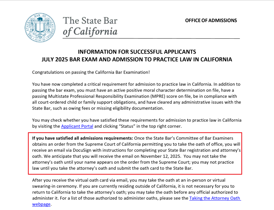但是!!要注意,通过考试之后我们还没有到万事大吉的时刻哦,成为加州执业律师我们还差关键一步——宣誓入会(成绩有效期保留5年,5年内必须宣誓完毕)。