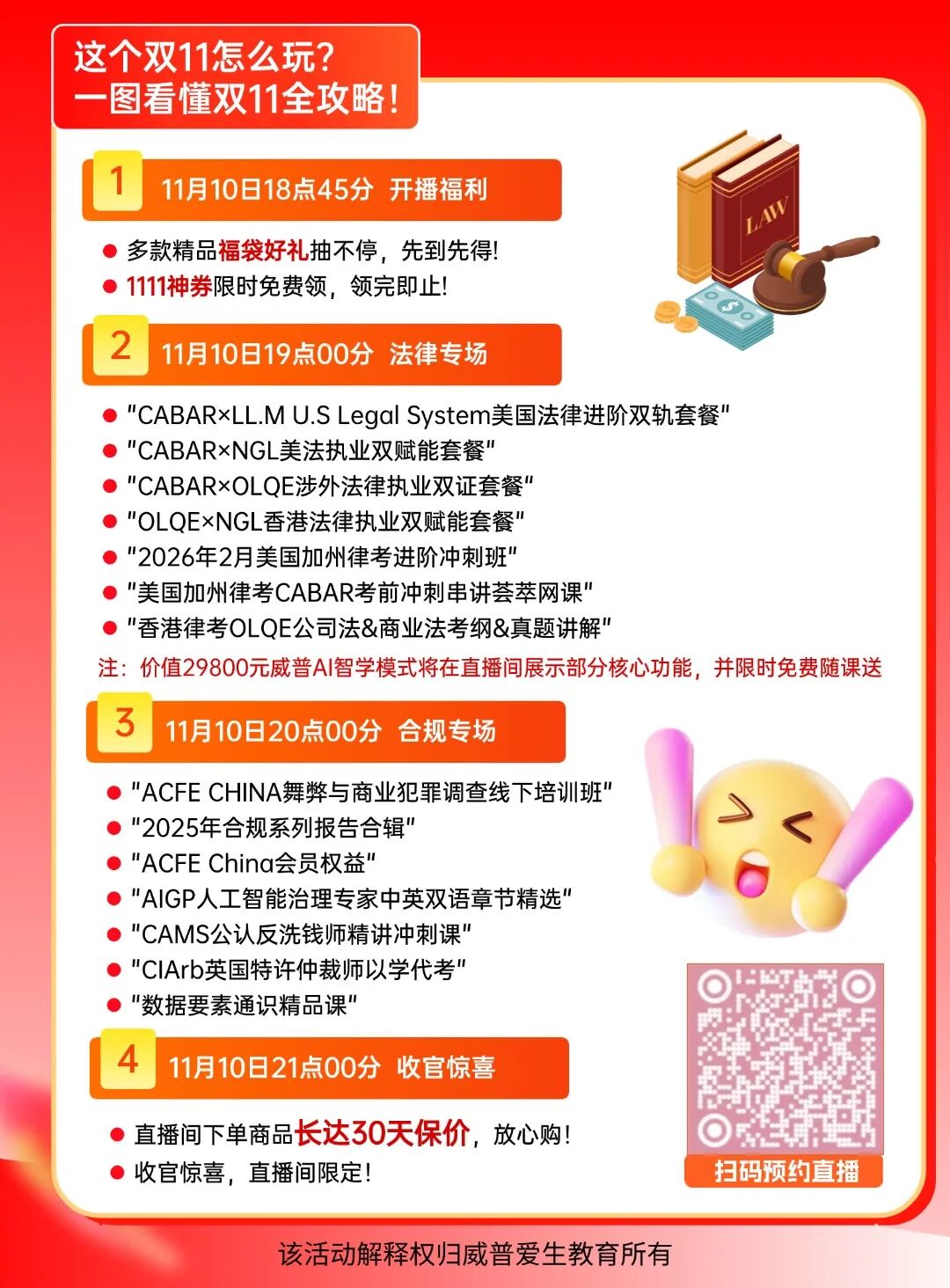马上双十一了!买啥不如买知识,今晚19:00-21:00,双十一钜惠盛典,法律合规专场,正价课程折上折!正价课程全年冰点价格!速速预约,锁定优惠!