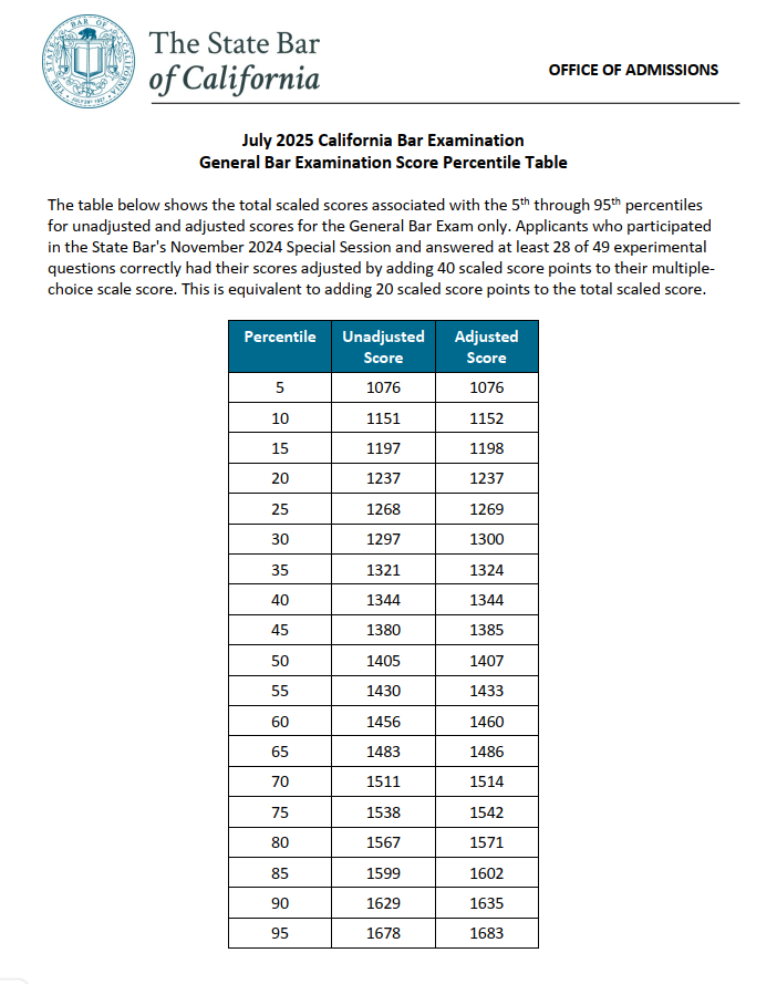 下表显示了仅针对2025年7月份加州综合律师考试(GBE)中,未调整分数(unadjusted scores)和调整后分数(adjusted scores)在第 5 百分位(5th percentile)至第 95 百分位(95th percentile)对应的 “总标准分(total scaled scores)”。