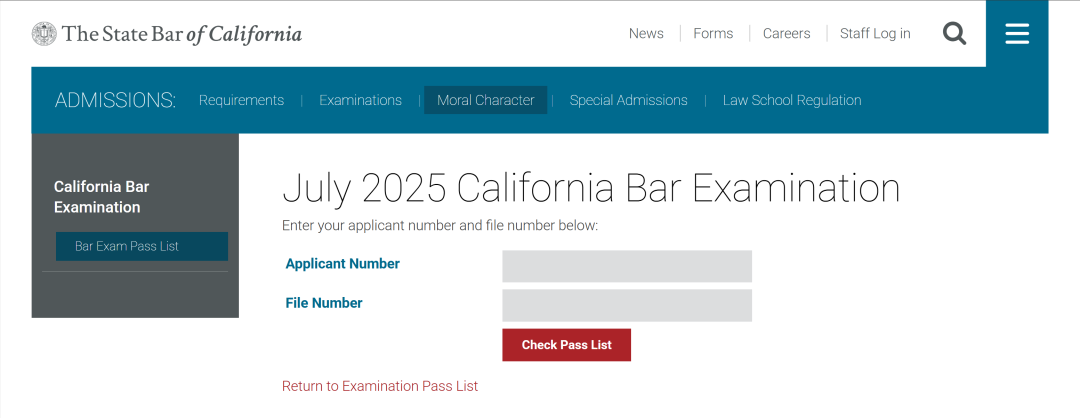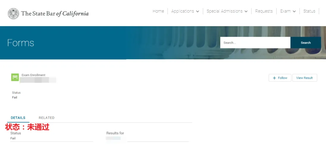 方法二:大家也可以通过登录https://admissions.calbar.ca.gov/s/login后查询。(如果通过方法一已查到通过信息,但是在方法二里暂时未查询到,有可能是官方信息未同步,可以晚些再查询)
