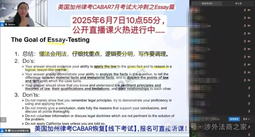 为了更好地应对美国加州律考CABAR,我们也上线了一系列直播课程(包含公开课及内部学员专属直播)目前Serena老师的USBAR美国律考系列直播持续更新中!