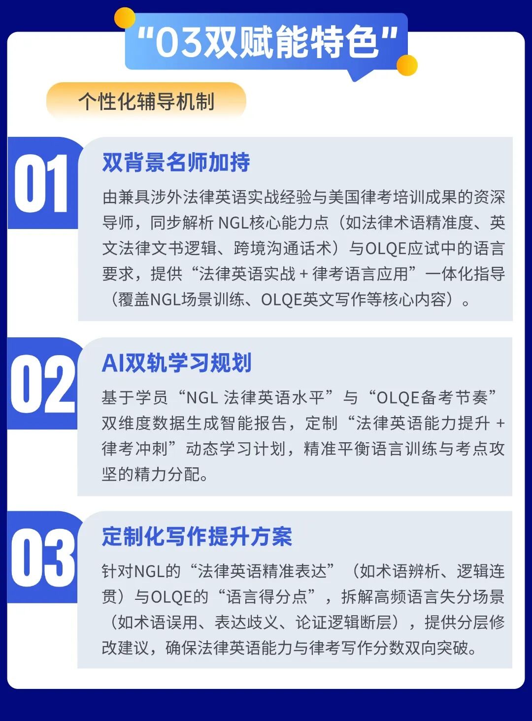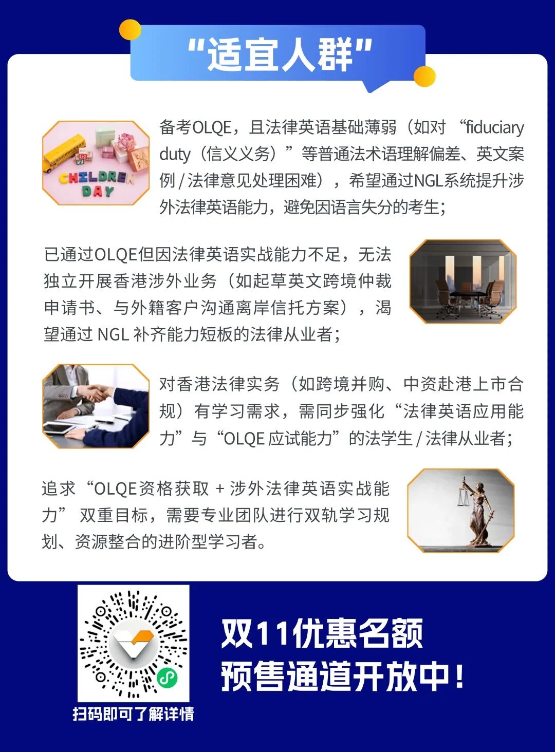 ✔备考OLQE但法律英语基础弱(对“fiduciaryduty”这类术语理解偏差、英文案例处理困难),想通过NGL系统提升的考生;