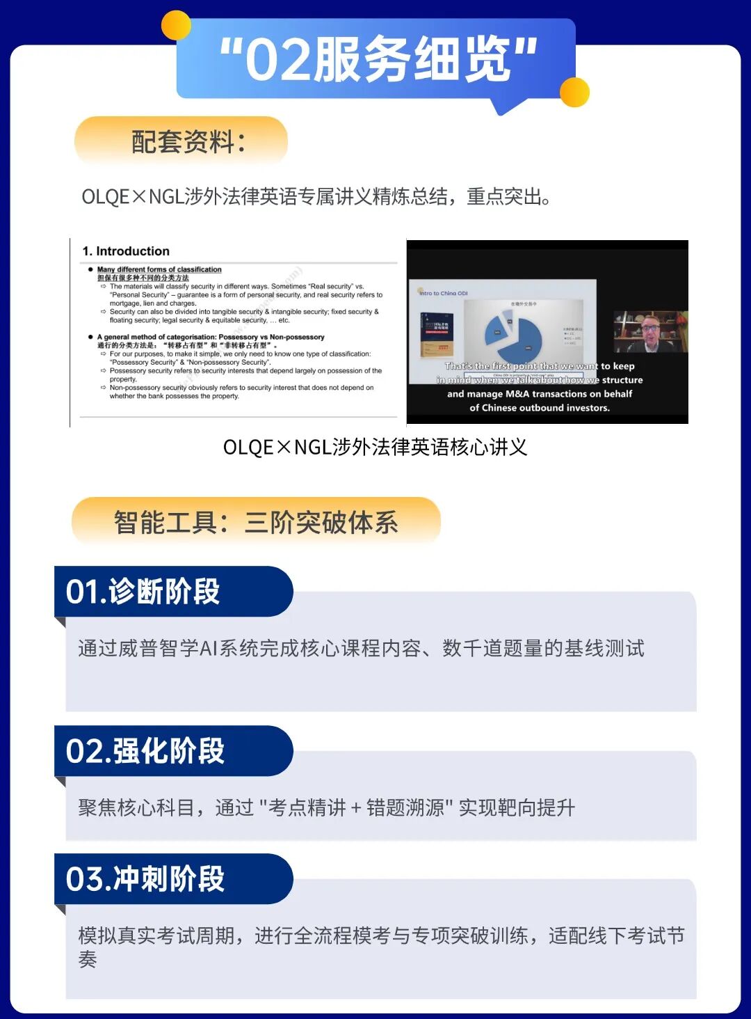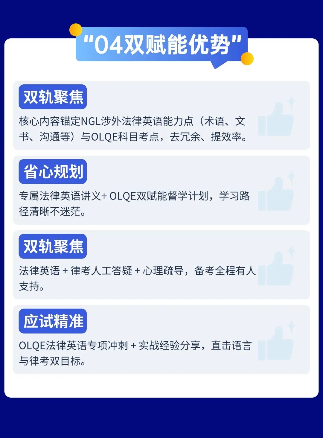 ✅学习灵活无压力:名师精讲NGL法律英语、OLQE重难点,还有录播可以反复看,碎片化和系统化学习节奏都能适配,在职备考也能轻松hold住。