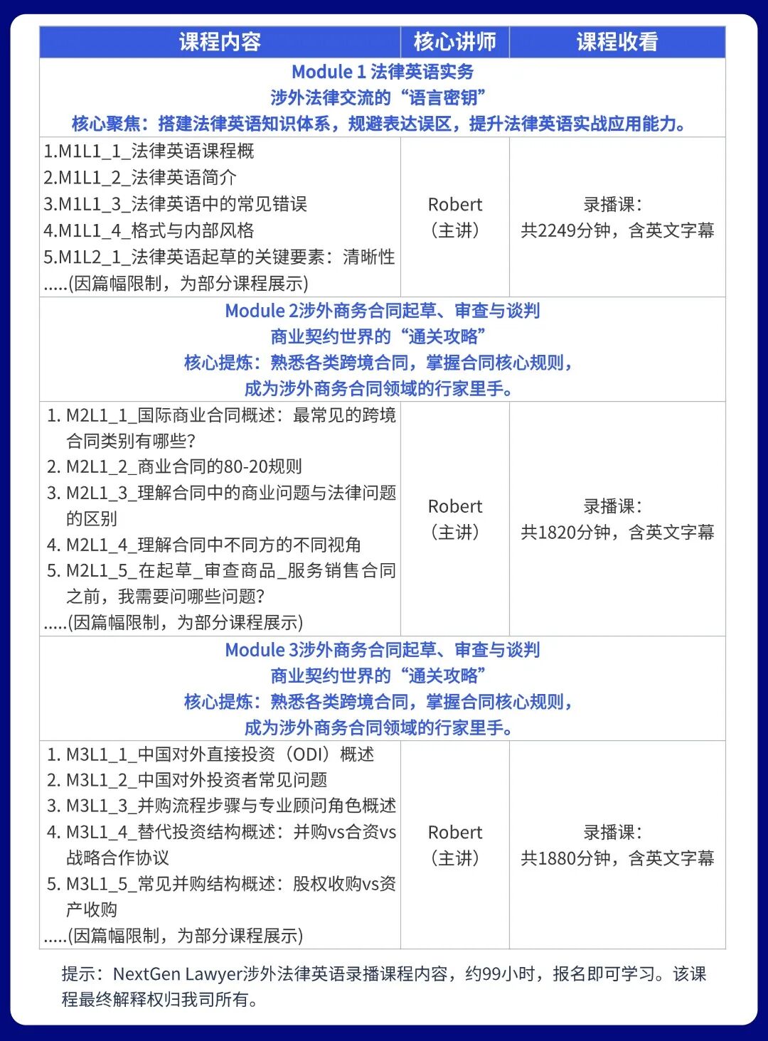 NGL分3个Module,从法律英语实务到涉外合同、国际并购交易,全是实战干货;