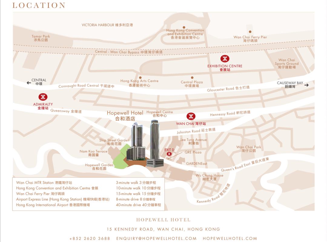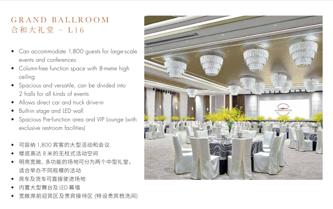 酒店除了设有湾仔区广阔的绿化公园,提供1,000间客房和套房以满足全部旅客的需求外,亦辅以超过6,500平方米的无柱式活动空间,并提供不同的餐饮及休闲设施,包括湾仔区内非常大的购物及时尚生活空间 ─ 合和商场。