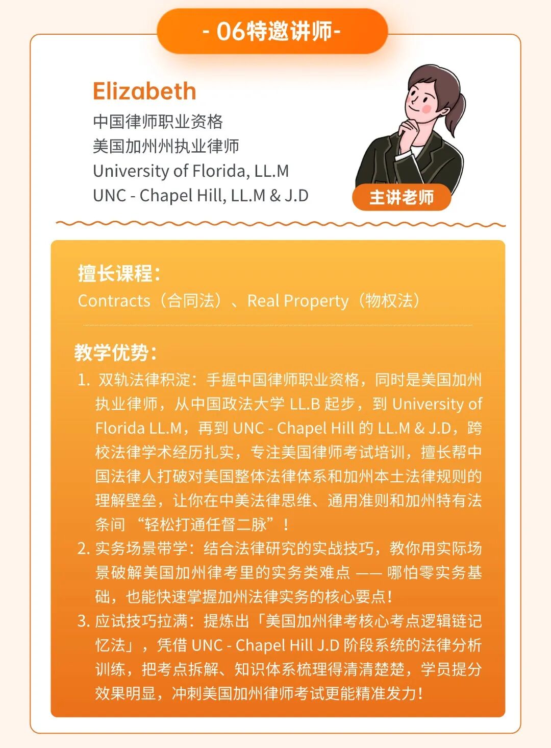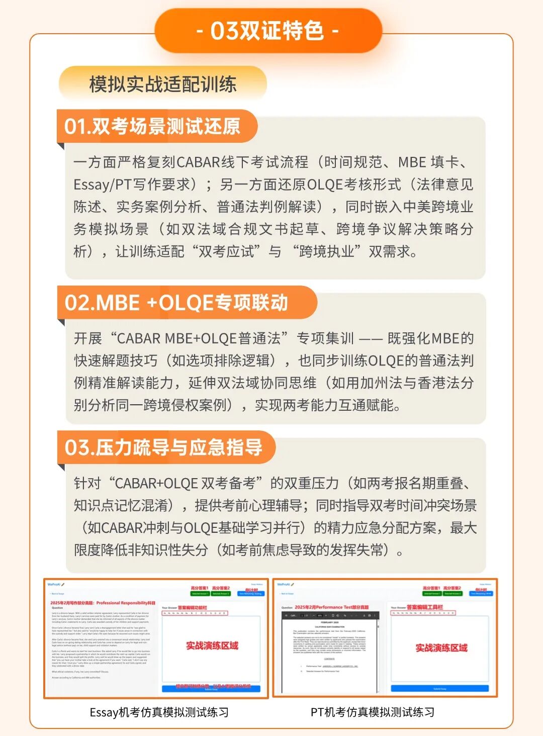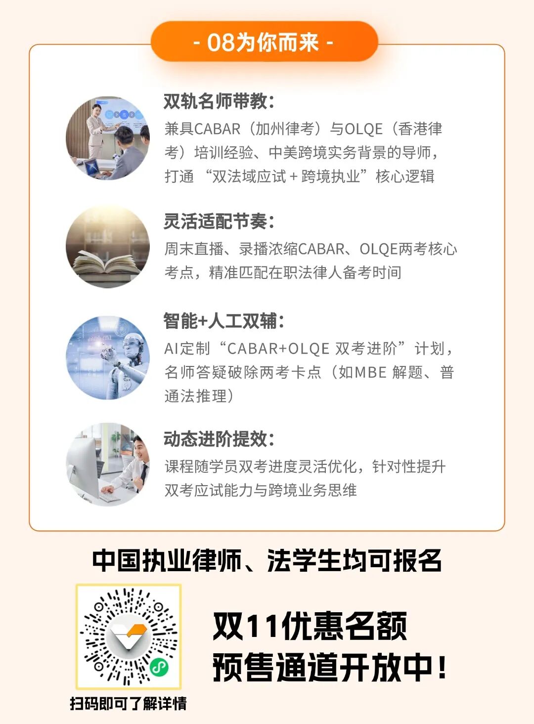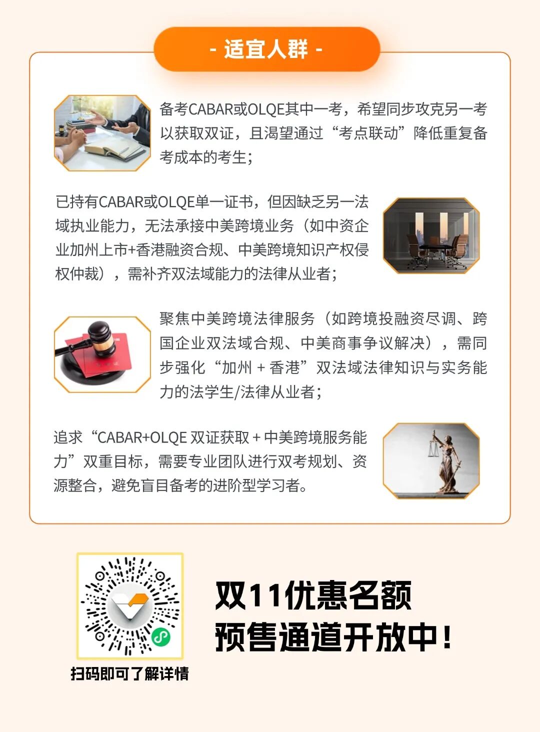 ✅法域衔接绝绝子:聚焦CABAR(加州律考)和OLQE(香港律考)的共通点(普通法推理逻辑、跨境争议解决思路)和差异点(加州MBE联邦法vs香港普通法原理等),通过“考点联动教学”打破重复备考壁垒,再也不用怕“考了加州证却接不了中国香港业务,有了中国香港证又做不了美国业务”。